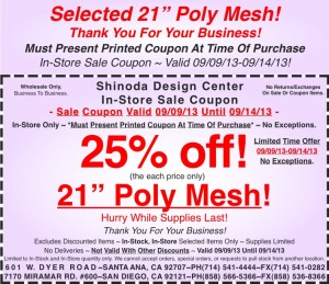 In Store Coupon: 25% off Selected 21″ Poly Mesh!