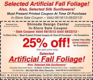 In-Store Coupon: 25% off Selected Artificial Fall Foliage! Also, Selected Silk Sunflowers!