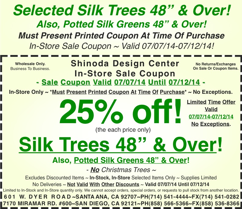In-Store Coupon: 25% off Selected Silk Trees 48″ & Over! Also, Potted Silk Greens 48″ & Over!
