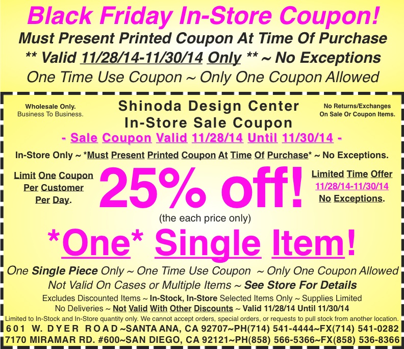 This entry was posted in 2014, In-Store Coupon, Promos, San Diego, Santa Ana, Shinoda Design Center and tagged , , . Bookmark the permalink.