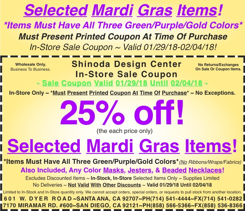 This entry was posted in 2018, Coupon, In-Store Coupon, Mardi Gras, Promos, San Diego, Santa Ana, Shinoda Design Center, Uncategorized and tagged , , , , , . Bookmark the permalink.