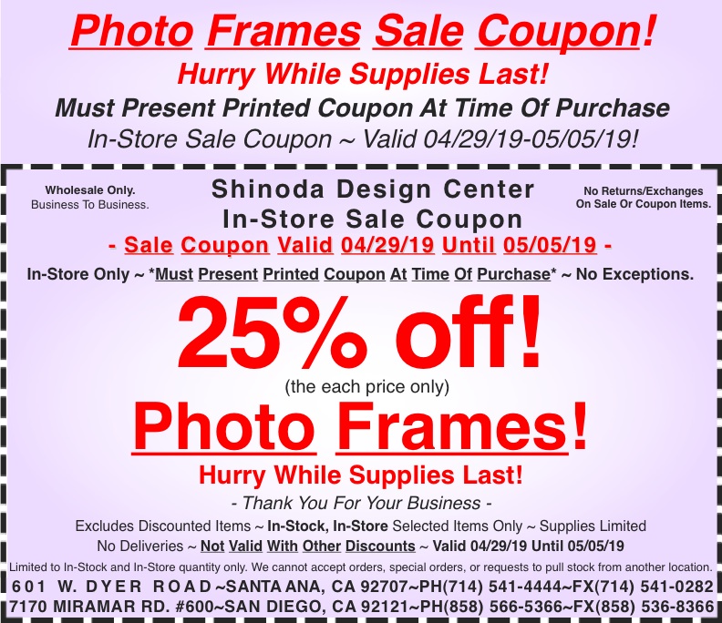 New sale coupon for you to use in-store. Make sure you print it out and bring it in to use. To print, click on the coupon and a printable version will load. We will only accept printed coupons. Coupons presented via cellphone, tablet, or any other means will not be accepted.