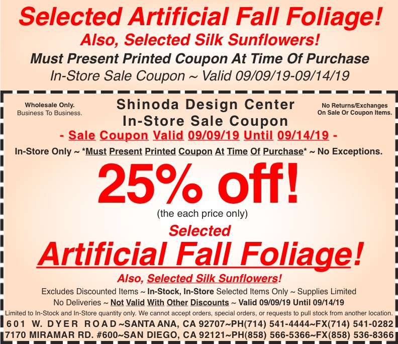 In Store Coupon: 25% off Selected Artificial Fall Foliage! Also, Selected Silk Sunflowers!