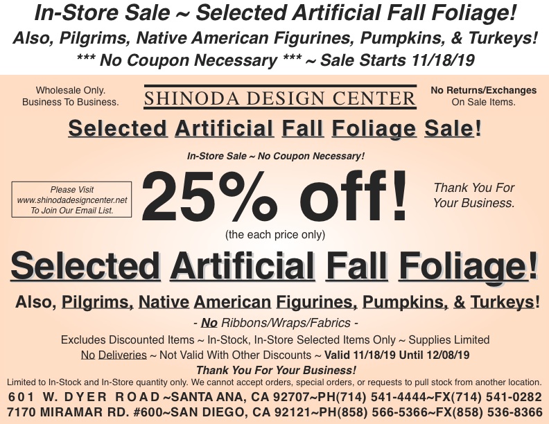 Store Special: 25% off Selected Artificial Fall Foliage! Also, Pilgrims, Native American Figurines, Pumpkins, & Turkeys! *Starts Nov. 18th*