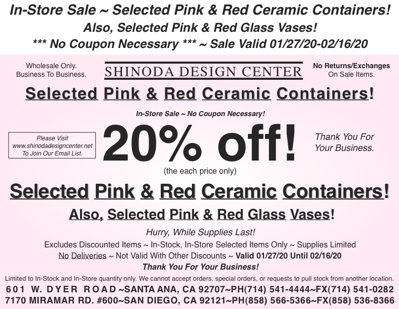 Store Special: 20% off Selected Pink & Red Ceramic Containers! Also, Selected Pink & Red Glass Vases!