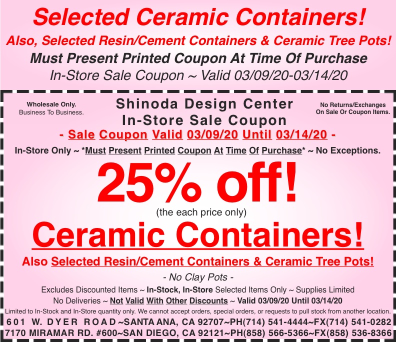 In-Store Coupon: 25% off Selected Ceramic Containers! Also, Selected Resin/Cement Containers & Ceramic Tree Pots!