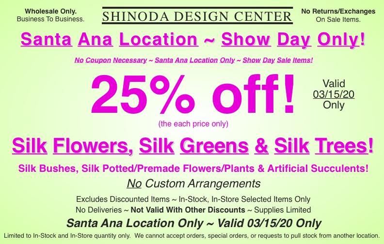 Free Santa Ana Wedding/Spring Design Show Sunday 03/15/20 10am-3pm With Guest Designer Del Langdale…Come Spend The Day With Us!