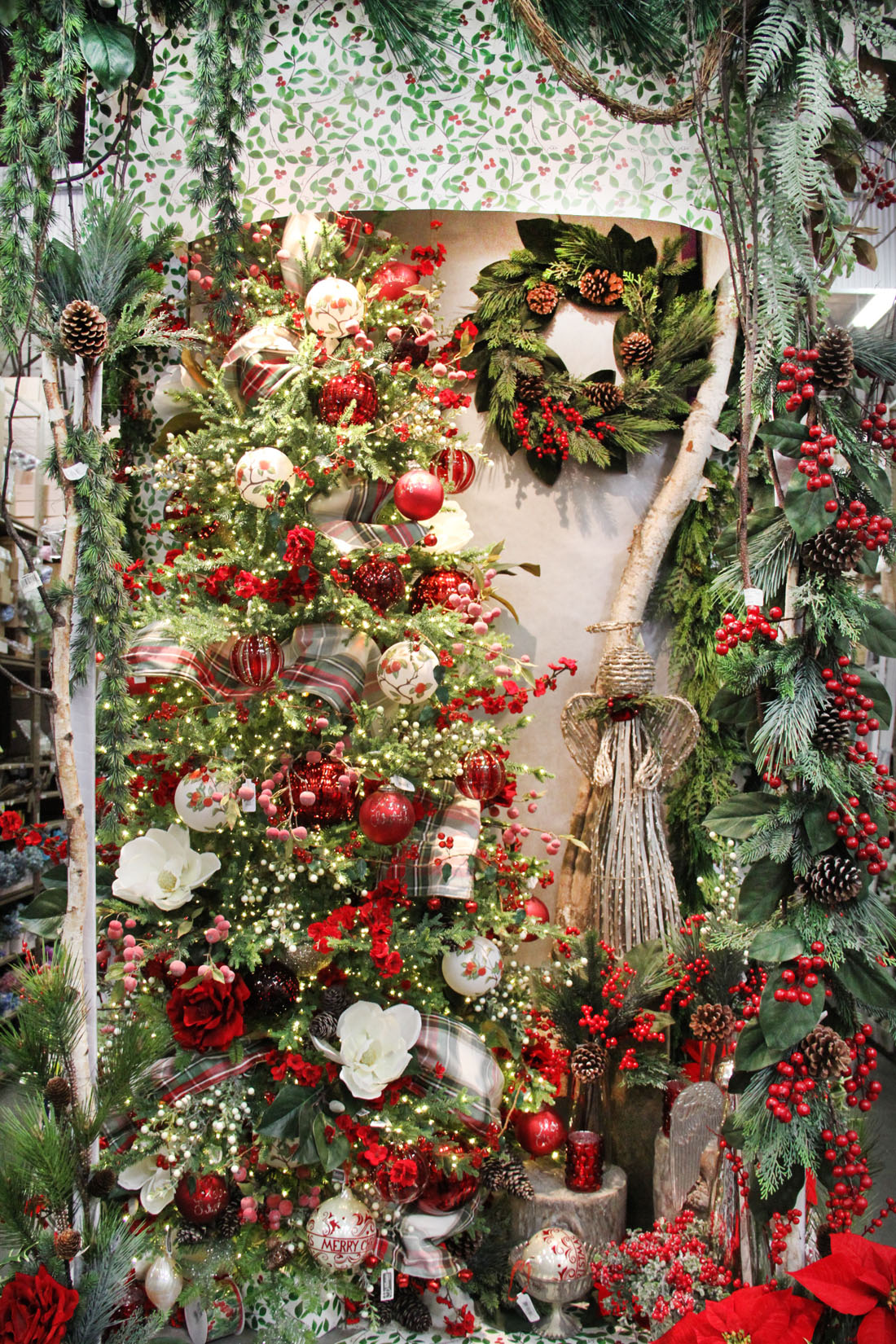 Design your own comfortable and cozy Christmas this year!  Magnolia leaves, long needle pine, red berries and pine cones go perfectly with our red velvet cherry blossom branches and roses.  Beautiful plaid, ribbons and unique ornaments complete a traditional homey atmosphere.  This is one of our many incredible San Diego displays by Noel Tribbey AIFD, Sammy Chiem AIFD, and our San Diego design teams.