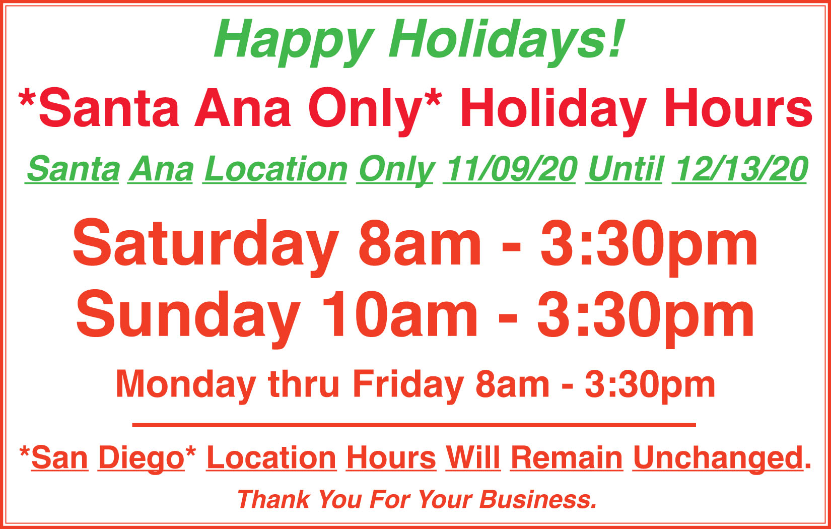 ***Santa Ana Location Only*** Extended Holiday Hours.