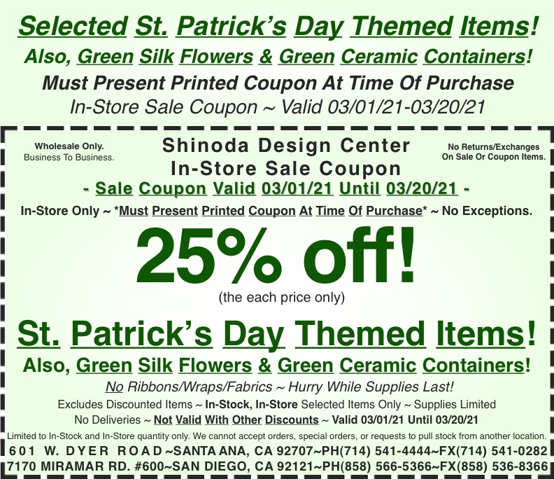 In-Store Coupon: 25% off Selected St. Patrick’s Day Themed Items! Also, Green Silk Flowers & Green Ceramic Containers!