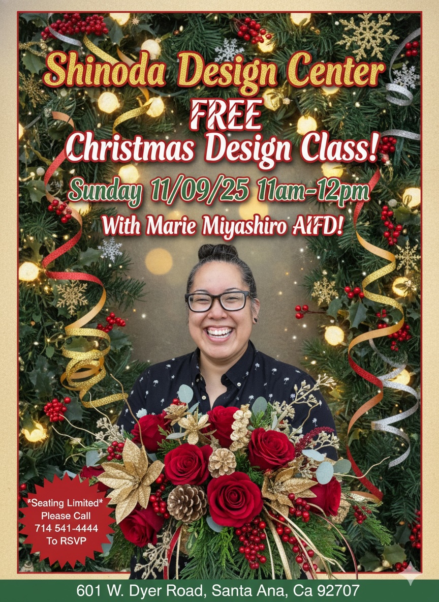 Come See Amazing Designer Marie Miyashiro AIFD…Free Christmas Design Class ~ Sunday, November 9, 2025 11am-12pm! *Seating Limited ~ Please Call To RSVP*