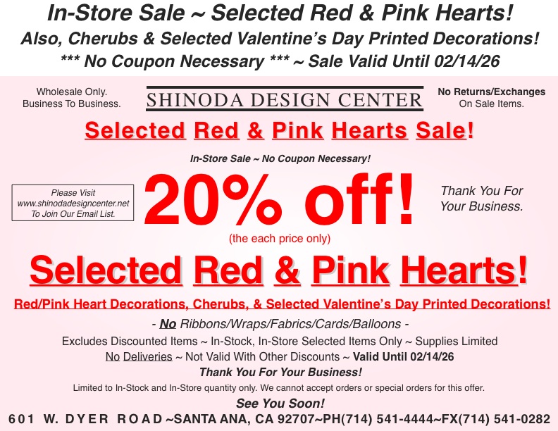 Store Special: 20%off Selected Red & Pink Hearts! Also, Cherubs & Selected Valentine’s Day Printed Decorations!