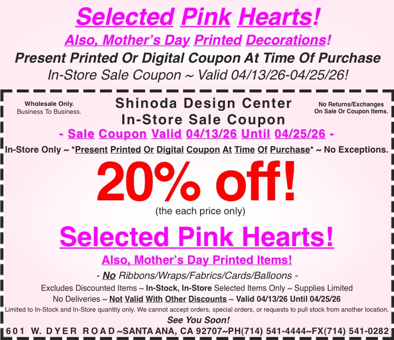 In-Store Coupon: 20%off Selected Pink Hearts! Also, Mother’s Day Printed Decorations!